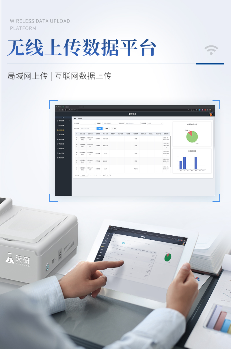 | 儀器采用手提式一體化系統(tǒng)檢測(cè)技術(shù),將分光光度模塊、新型農(nóng)殘檢測(cè)模塊、數(shù)字化管理模塊、無(wú)線通訊模塊高度集成于一體,支持檢測(cè)200種食品安全檢測(cè)項(xiàng)目,同時(shí)預(yù)留升級(jí)檢測(cè)方法。 | 儀器檢測(cè)模塊標(biāo)準(zhǔn)化、智能化,檢測(cè)項(xiàng)目可隨意自由組合。檢測(cè)箱體內(nèi)置多個(gè)標(biāo)準(zhǔn)檢測(cè)單元,檢測(cè)模塊可以調(diào)整配置。 | 顯示屏幕:儀器采用10.1英寸豎向液晶觸摸屏顯,搭配運(yùn)行安卓智能操作系統(tǒng),主控芯片采用ARM Cortex-A7,RK3288/4核處理器,主頻1.88Ghz,操作方便,性能更強(qiáng)。 | 檢測(cè)通道:≥12通道;采用精密旋轉(zhuǎn)比色池設(shè)計(jì),使用同芯片同光源校準(zhǔn)精度,解決不同光源之間的誤差值,更加準(zhǔn)確**。(1-12通道間誤差0.1%,**號(hào):ZL202022821055.2) | 儀器光源:高精度進(jìn)口四波長(zhǎng)冷光源,每個(gè)通道均配置 410、520、590、630nm 波長(zhǎng)光源,標(biāo)配**的光路切換裝置,**光路切換功能可實(shí)現(xiàn)64波長(zhǎng),并且所有檢測(cè)項(xiàng)目可實(shí)現(xiàn)所有通道同時(shí)檢測(cè)。 | 設(shè)備可一鍵校準(zhǔn),自動(dòng)保存校準(zhǔn)數(shù)據(jù),自動(dòng)對(duì)比校驗(yàn),得到精準(zhǔn)光源,采用Android SP存儲(chǔ)數(shù)據(jù),光源數(shù)據(jù)永不丟失,方便每一次使用。 | 通訊接口:配備無(wú)線通信模塊、4G(APN)通訊模塊、藍(lán)牙傳輸,同時(shí)具有雙USB接口以及RJ45網(wǎng)線接口,可以多方式實(shí)現(xiàn)數(shù)據(jù)保存及數(shù)據(jù)傳輸 | 存儲(chǔ)方式:支持U盤存儲(chǔ),標(biāo)準(zhǔn)USB接口,免驅(qū)動(dòng)安裝。檢測(cè)結(jié)果存儲(chǔ)容量20萬(wàn)條以上,可生成Excel表格進(jìn)行拷貝,并具有登錄保護(hù)功能。 | 智能化操作系統(tǒng): | 1)操作系統(tǒng):儀器可在同一檢測(cè)界面自動(dòng)對(duì)應(yīng)相關(guān)檢測(cè)通道,一次性選擇1-12個(gè)樣品名稱,無(wú)需退出界面,節(jié)省操作時(shí)間。并可以對(duì)每個(gè)通道屬性和樣品信息單獨(dú)進(jìn)行編輯,例如送檢單位、人員,檢測(cè)人員等,打印時(shí)勾選打印顯示。 | 2)數(shù)據(jù)集成系統(tǒng):設(shè)備首頁(yè)自動(dòng)匯總分析檢測(cè)數(shù)據(jù),包含:周檢測(cè)數(shù)據(jù)、月檢測(cè)數(shù)據(jù),全部檢測(cè)總數(shù)量,均包含檢測(cè)總數(shù),合格數(shù),不合格數(shù),以及相關(guān)柱形分析圖,各項(xiàng)檢測(cè)數(shù)據(jù)一目了然,無(wú)需電腦查詢,更加快捷直觀。 | 3)數(shù)據(jù)庫(kù)系統(tǒng):十幾項(xiàng)數(shù)據(jù)庫(kù)分類管理儀器:包含項(xiàng)目類型、項(xiàng)目數(shù)據(jù)、檢測(cè)數(shù)據(jù)、歷史記錄、國(guó)標(biāo)信息、曲線信息、采樣信息、檢測(cè)信息、受檢信息、復(fù)核信息、圖表信息、光源校準(zhǔn)信息、打印樣式信息、樣品庫(kù)信息等等,數(shù)據(jù)庫(kù)之間互相協(xié)調(diào)聯(lián)動(dòng)保證數(shù)據(jù)的真實(shí)完整性。同時(shí)產(chǎn)品數(shù)據(jù)庫(kù)以及歷史檢測(cè)記錄支持一鍵檢索功能。 | 4)限量規(guī)判系統(tǒng):具有限量查詢、添加物質(zhì)合規(guī)判定系統(tǒng)。檢測(cè)出結(jié)果后,系統(tǒng)自動(dòng)調(diào)用系統(tǒng)數(shù)據(jù)庫(kù)中相關(guān)國(guó)標(biāo)進(jìn)行比對(duì)判定,客觀顯示判定結(jié)果是否合格。 | 5)項(xiàng)目預(yù)設(shè)系統(tǒng):儀器具有任務(wù)預(yù)設(shè)模塊,一鍵提前預(yù)設(shè),給出方便快捷的新檢測(cè)方案,每一個(gè)任務(wù)分別可以設(shè)置不同的樣品、批次、編號(hào)、來(lái)源、備注、抽樣信息、檢測(cè)信息、受檢信息、復(fù)核信息等更多信息。樣品送檢時(shí)一鍵調(diào)取保存信息,并可多次調(diào)取,大大提高檢測(cè)效率。 | 6)數(shù)據(jù)監(jiān)管系統(tǒng):同步對(duì)接監(jiān)管平臺(tái),數(shù)據(jù)可局域網(wǎng)和互聯(lián)網(wǎng)數(shù)據(jù)上傳,檢測(cè)結(jié)果可選擇直接傳至食品安全監(jiān)管平臺(tái)。進(jìn)行區(qū)域食品安全監(jiān)管及大數(shù)據(jù)分析處理與數(shù)據(jù)統(tǒng)計(jì),檢測(cè)區(qū)域食品安全長(zhǎng)短期動(dòng)態(tài),達(dá)到食品安全問(wèn)題預(yù)估、預(yù)警。 | 7)打印系統(tǒng):內(nèi)置全新打印機(jī),新創(chuàng)自定義打印方式,可按需靈活勾選控制:產(chǎn)品合格證(國(guó)家農(nóng)業(yè)部標(biāo)準(zhǔn)要求),二維碼,抽樣信息、檢測(cè)信息,受檢信息、復(fù)核信息、抽樣日期、檢測(cè)日期等信息的打印。 | 供電模式:儀器交直流兩用,直流12V供電,可連接車載電源,可配6ah大容量充電鋰電池,電量可實(shí)時(shí)顯示,方便戶外流動(dòng)測(cè)試。 | 膠體金檢測(cè)模塊:采用雙通道CMOS成像處理技術(shù)及膠體金免疫層析技術(shù),可同時(shí)讀取雙膠體金卡數(shù)據(jù),自動(dòng)采集、處理分析,將檢測(cè)結(jié)果顯示,并可根據(jù)參考限值自動(dòng)判斷檢測(cè)結(jié)果,可檢測(cè)常見(jiàn)的獸藥殘留、生物毒素、抗生素、違禁添加物等。 | 1)探測(cè)技術(shù):CMOS成像探測(cè); | 2)檢測(cè)通道:1個(gè)通道; | 3)檢測(cè)方式:消線法和比色法; | 4)顯示模式:陰性或陽(yáng)性; 