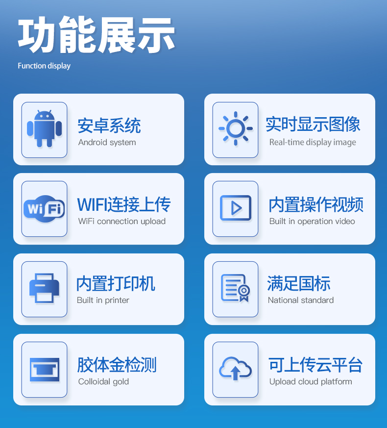 | 安卓智能操作系統(tǒng),采用更加**UI交互界面,儀器具有wifi聯(lián)網(wǎng)上傳、4G聯(lián)網(wǎng)傳輸、GPRS無線遠(yuǎn)傳、網(wǎng)線連接功能,快速批量上傳數(shù)據(jù)。 | 智能化程度高,儀器具有自檢功能:具有開機(jī)自檢和調(diào)零功能,具有自動(dòng)檢測重復(fù)性功能。 | 新一代高速熱敏打印機(jī),檢測完成可自動(dòng)打印檢測報(bào)告和二維碼。 | 儀器帶有監(jiān)管平臺(tái),數(shù)據(jù)可局域網(wǎng)和互聯(lián)網(wǎng)數(shù)據(jù)上傳,檢測結(jié)果直接傳至食品安全監(jiān)管平臺(tái)。進(jìn)行區(qū)域食品安全監(jiān)管及大數(shù)據(jù)分析處理與數(shù)據(jù)統(tǒng)計(jì),檢測區(qū)域食品安全長短期動(dòng)態(tài),達(dá)到食品安全問題預(yù)估、預(yù)警 | 一體化便攜式快檢設(shè)備,滿足現(xiàn)場及流動(dòng)檢測使用需求,能夠在同一軟件下實(shí)現(xiàn)所有檢測項(xiàng)目的檢測,并可通過同一窗口直觀顯示檢測結(jié)果。 | 膠體金模塊檢測方式:軌道式自動(dòng)傳輸掃描,檢測完成后自動(dòng)退出檢測卡。 | 一體化主機(jī),包含食品安全檢測模塊、多通道農(nóng)藥殘留檢測模塊、膠體金免疫層析檢測模塊。 | CT線自動(dòng)識(shí)別,無需手動(dòng)調(diào)整。 | 儀器具有品類多種類樣品菜單庫,可靈活選擇檢測樣品,不同的檢測通道可同時(shí)檢測不同的樣品項(xiàng)目。。 | 樣品處理簡單省力,整體操作快速、安全、便捷。 | 儀器具有自身保護(hù)功能,可設(shè)置用戶名及密碼,防止非工作人員操作等。 | 高靈敏度,高檢測精度,高重復(fù)性精度,掃描式高精度光學(xué)傳感器。 | 儀器具有重新校準(zhǔn)、鎖定、恢復(fù)出廠設(shè)置功能。 | 內(nèi)置強(qiáng)大的數(shù)據(jù)庫,可在儀器上直接選擇樣品名稱、檢測指標(biāo)、送檢單位等信息,也可在儀器上直接編輯錄入樣品名稱、檢測指標(biāo)、送檢單位等信息并保存進(jìn)樣品數(shù)據(jù)庫。 | 儀器具有重新校準(zhǔn)、鎖定、恢復(fù)出廠設(shè)置功能。 | 結(jié)果判定線可修改,對照值標(biāo)定值可保存,斷電不丟失數(shù)據(jù)。 | 兼容市場上所有的膠體金卡,使用耗材不受限制,極大增強(qiáng)用戶使用體驗(yàn)。 |